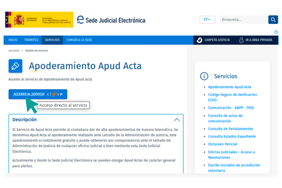 El trámite se realiza directamente desde la Sede Judicial Electrónica, accediendo al apartado específico de Apoderamiento Apud Acta.